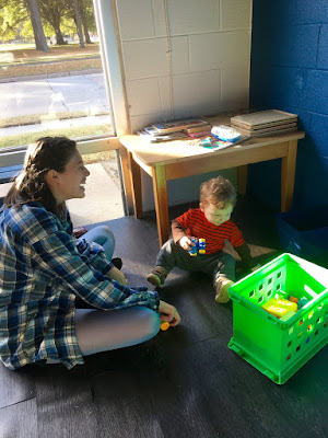 A nice fall afternoon calls for a run through the leaves. R, Auntie Chelsea, and I headed over to the Imagination Island, part of Northside Park. Before hitting the park, we went to Coaster Coffee, directly across the street. They have a small collection of toys, books, and puzzles for kids. The shop is local to Norfolk, and it operates as non-profit and gives back to the community by feeding the hungry, building community gardens, teaching art classes, and helping the unemployed. There is currently a toy drive going on. I wish that they were open on Sundays, but it is run by a church, so I get why it isn't. The toys were on a raised platform, which worried me a little bit for falling reasons, but it made me wonder if they ever have live music.